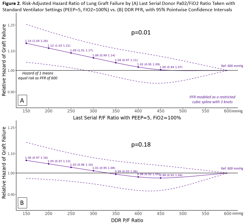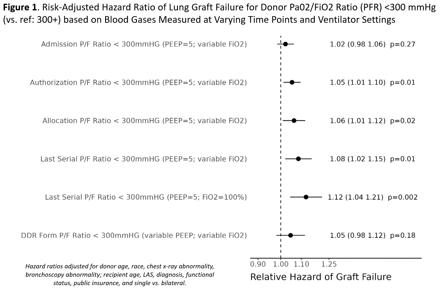 Purpose: The donor PaO2/FiO2 ratio (PFR) is highly associated with lung utilization yet often fails to manifest as a significant risk factor of lung graft failure in published studies. Though selection bias may play a role, this apparent lack of association may also stem from the most commonly studied PFR value (from the Deceased Donor Registration (DDR) form) not necessarily being obtained with conventional ventilator settings nor subsequent to donor management practices that can improve lung physiology.