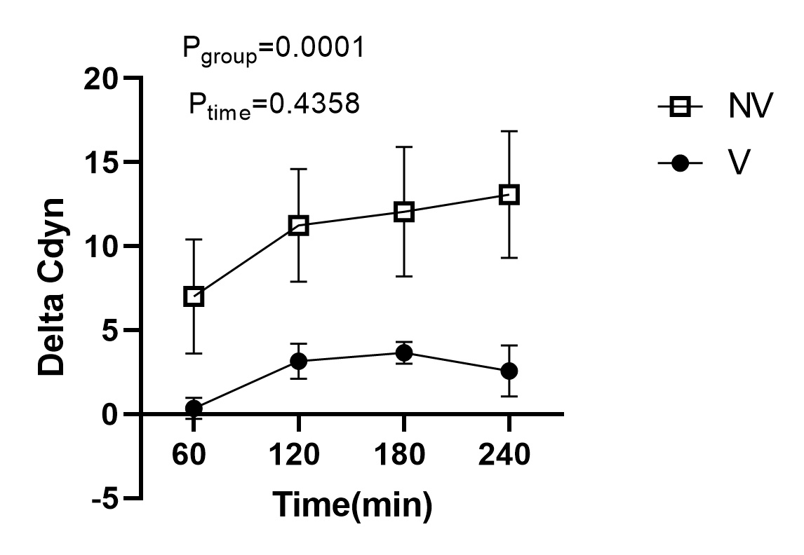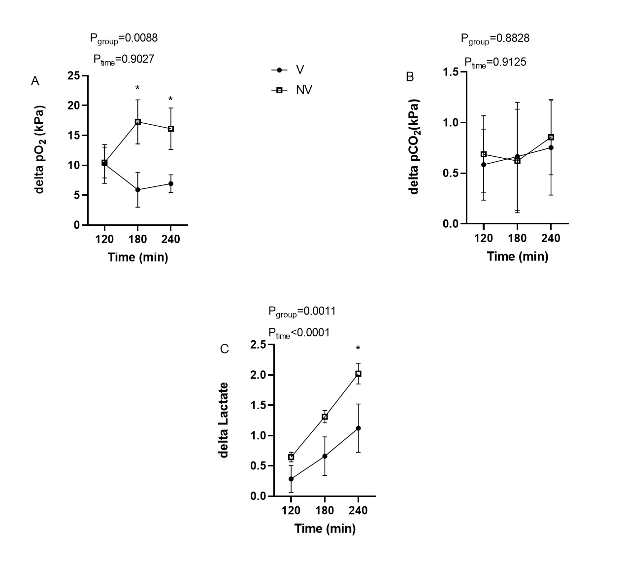 Results: NV presented a more expressive increase after 240 min of EVLP in the delta dynamic compliance (P=0.0001), delta pO2 (P=0.0082) and delta lactate (P=0.0011) than the V group. There were no differences between the groups in delta pCO2 (P=0.8828). Histology indicates that there are more units of hemorrhage at the end of EVLP in NV (P=0.0848) than V. Hemorrhage decreases from the ischemia time to the end of EVLP (V P=0.0031; NV P=0.0457). During the perfusion ASAT and LDH did not differ between the groups (P=0.7828 and P=0.9749).