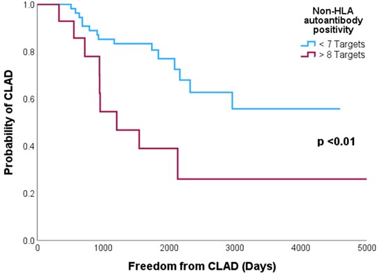 Conclusion: recipients with increased positivity to non-HLA autoantibodies pre-transplants demonstrate increased risk of CLAD and decreased freedom from CLAD. Further research with larger cohorts is needed to determine which autoantibody targets associated with outcomes, and to define best cut-offs to define reactivity.