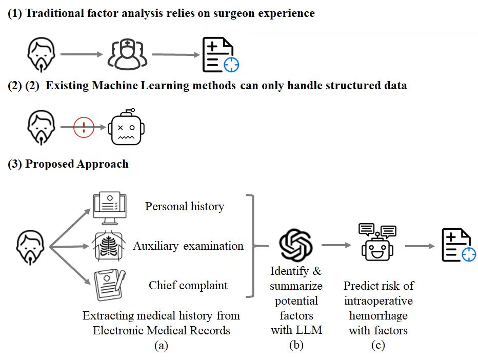 Results: Our retrospective study of 41 lung transplant recipients demonstrates the efficacy of this method, achieving an Area Under the Curve (AUC) of 0.9375. By inputting detailed medical histories into the LLM, we identified 211 potential risk factors, which were then grouped into 11 categories, including but not limited to Respiratory Diseases, Cardiovascular Diseases, ECMO Support, and COVID-19. Utilizing these factors, a Random Forest model was trained, resulting in the aforementioned AUC, signifying high accuracy in predicting intraoperative hemorrhage risks.