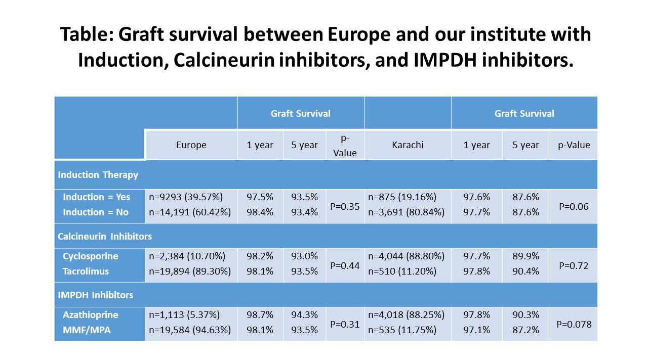 Results: Of the 4566 transplants, 4044 (88.5%) (Group A) were on CyA/AZA and Steroid, and 522 (11.4%) Group B was on TAC/MMF/Steroid. The mean recipient age in Group A was 28.81±10.52 vs 32.29±9.2 yrs in Group B (p<0.001). The mean donor age in Group A was 34.28±9.6 vs 33.02±8.22 yrs in Group B (p=0.005). The mean HLA mismatch in Group A was 1.83±1.3 vs 4.10±1.4 in Group B (p<0.001). Acute Rejection in Group A (18%) vs (17%) in Group B (p=0.535). Overall One and 5-year graft survival in Group A was 97.75% and 89.9% vs Group B 97.8% and 90.4% respectively (p<0.72). The cost of a 1-year CyA/AZA/Steroid was $650 vs $1,300 for TAC/MMF/Steroid. Graft survival rates were comparable between Europe and our institute vis a vis Induction therapy, Calcineurin inhibitors, and IMPDH inhibitors are given in the Table.
