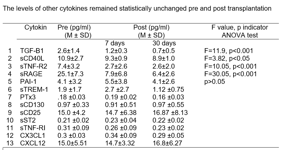 Results: Evaluation of 13 cytokines (TGF-β1, PAI-1, sTREM-1, PTX3, sCD40L, sCD25, CXCL12, sST2, sTNF-RI, sTNF-RII, sRAGE, CXCL1, sCD130) revealed notable variations pre and post transplantation. Specifically, TGF-β1, sCD40L, sTNF-RII, and sRAGE exhibited elevated levels pre transplantation, which significantly decreased post transplantation (p<0.05). Conversely, the levels of other cytokines remained statistically unchanged pre and post transplantation (p>0.05). (Table 1)