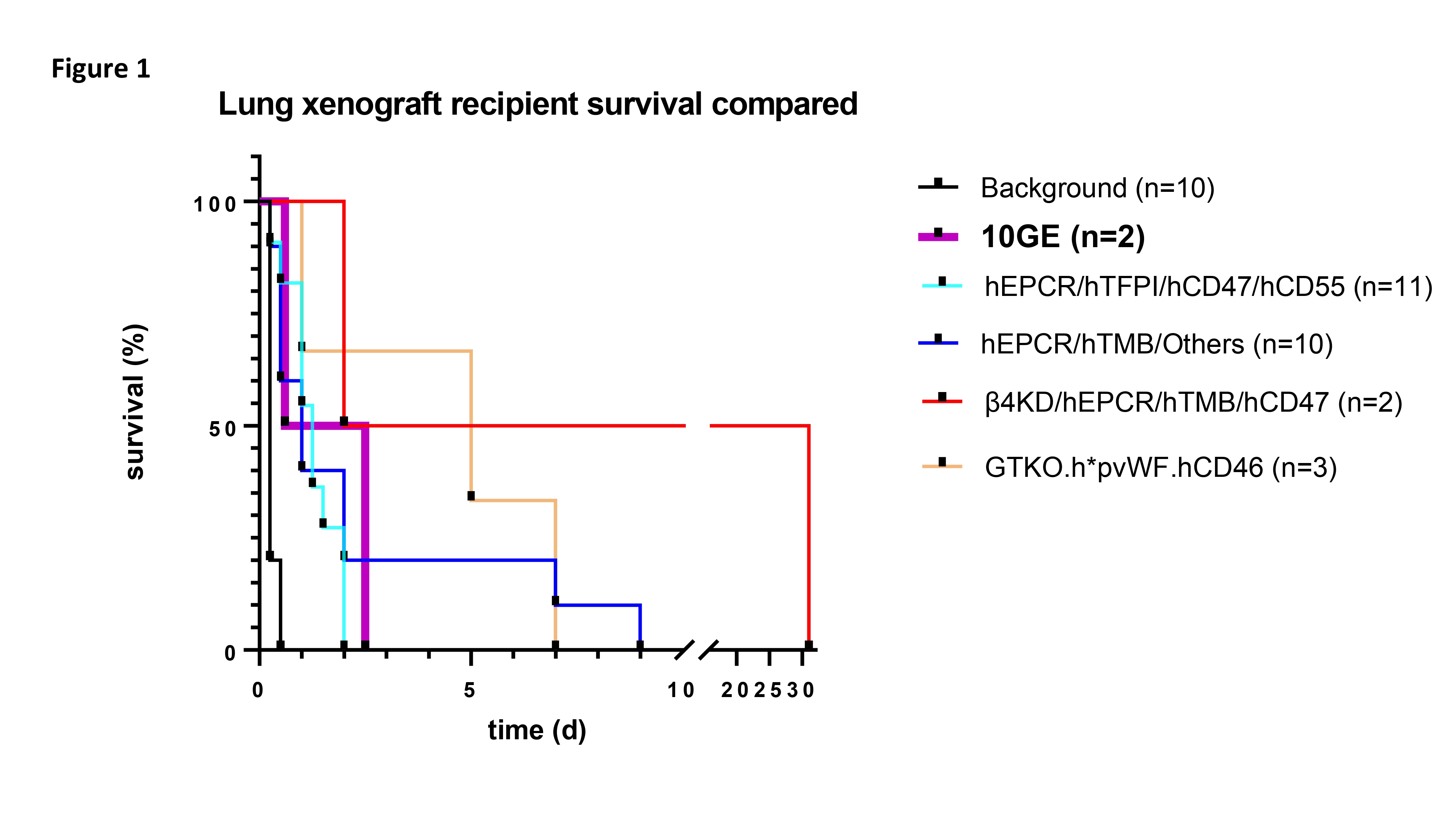 Conclusion: Using a pharmacologic cocktail designed to inhibit known mechanisms of lung xenograft injury, 10GE pig lungs, with or without pre-transplant kidney adsorption, exhibit survival similar to lungs with fewer gene edits, and shorter than the median survival obtained with h*pvWF modification on a simpler (GTKO.hCD46) background. Based on this preliminary data, we conclude that adding protection from NK cells by HLA-E expression to this 10GE model, and perhaps humanizing vWF or omitting the CMAHKO, may be necessary to achieve consistently prolonged pig lung xenograft survival in baboons.