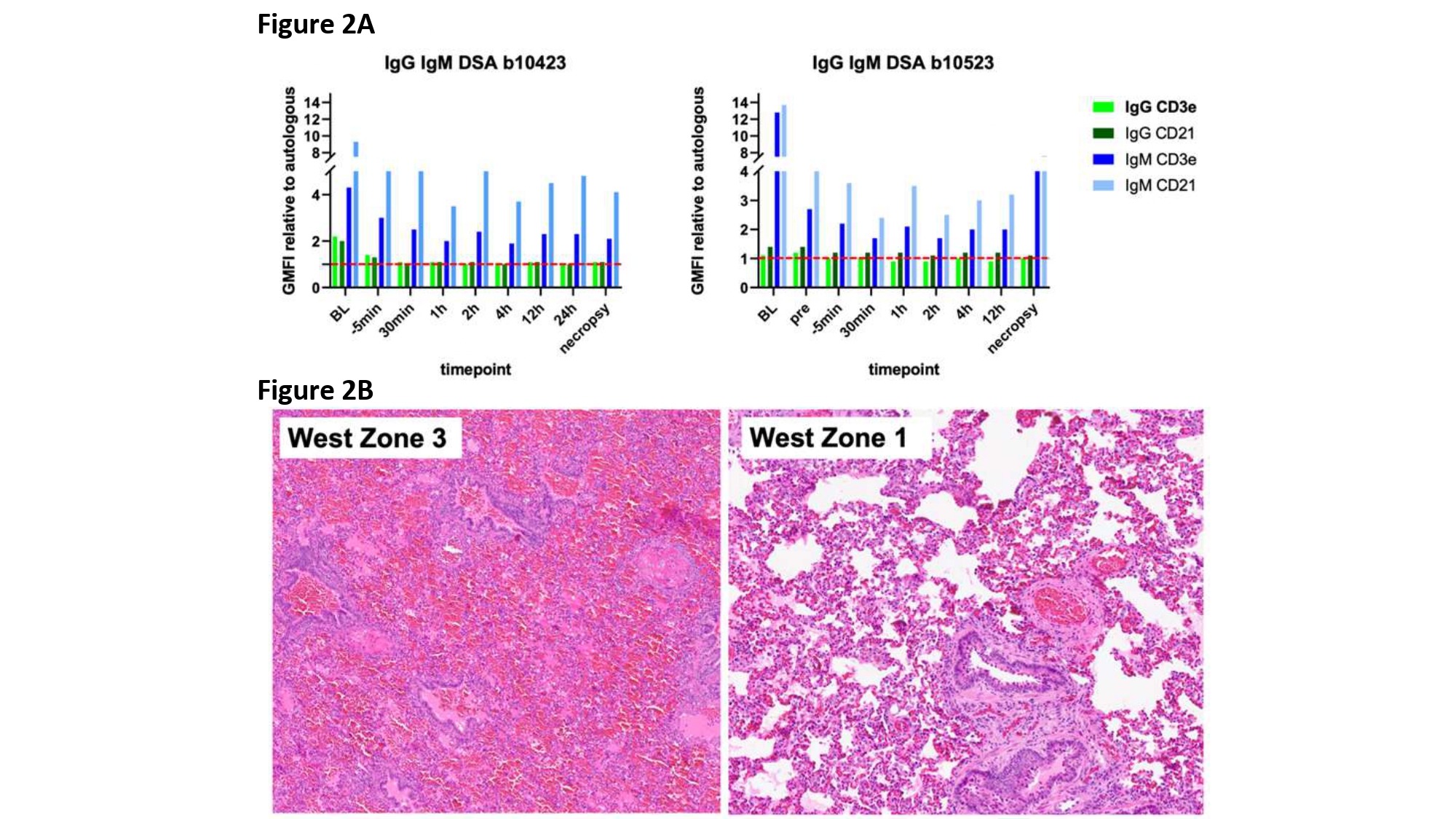 Results: Survival times were comparable to previously reported in vivo lung transplantation (figure 1). B10423 was extubated with good lung function at 44h post-transplant, but experienced sudden oxygen saturation decline at 60h, prompting study termination. B10523 developed increasingly sanguinous secretions from the xenograft within 14h. Donor specific IgG and IgM antibody (figure 2A) decreased following splenectomy and induction treatment with αCD20 and rATG, whereas renal preperfusion (right panel, pre vs -5) and lung xenograft revascularization (-5 versus subsequent) were associated with modest further decrease in anti-donor antibody titers. Day zero histology showed erythrocyte congestion in pulmonary alveolar capillaries in both cases and intravascular microthrombi in B10423. At necropsy, loss of vascular barrier function was manifest as alveolar flooding of dependent lung in both xenografts (figure 2B); inflammation of the native right lung was also observed in the longer-surviving recipient.