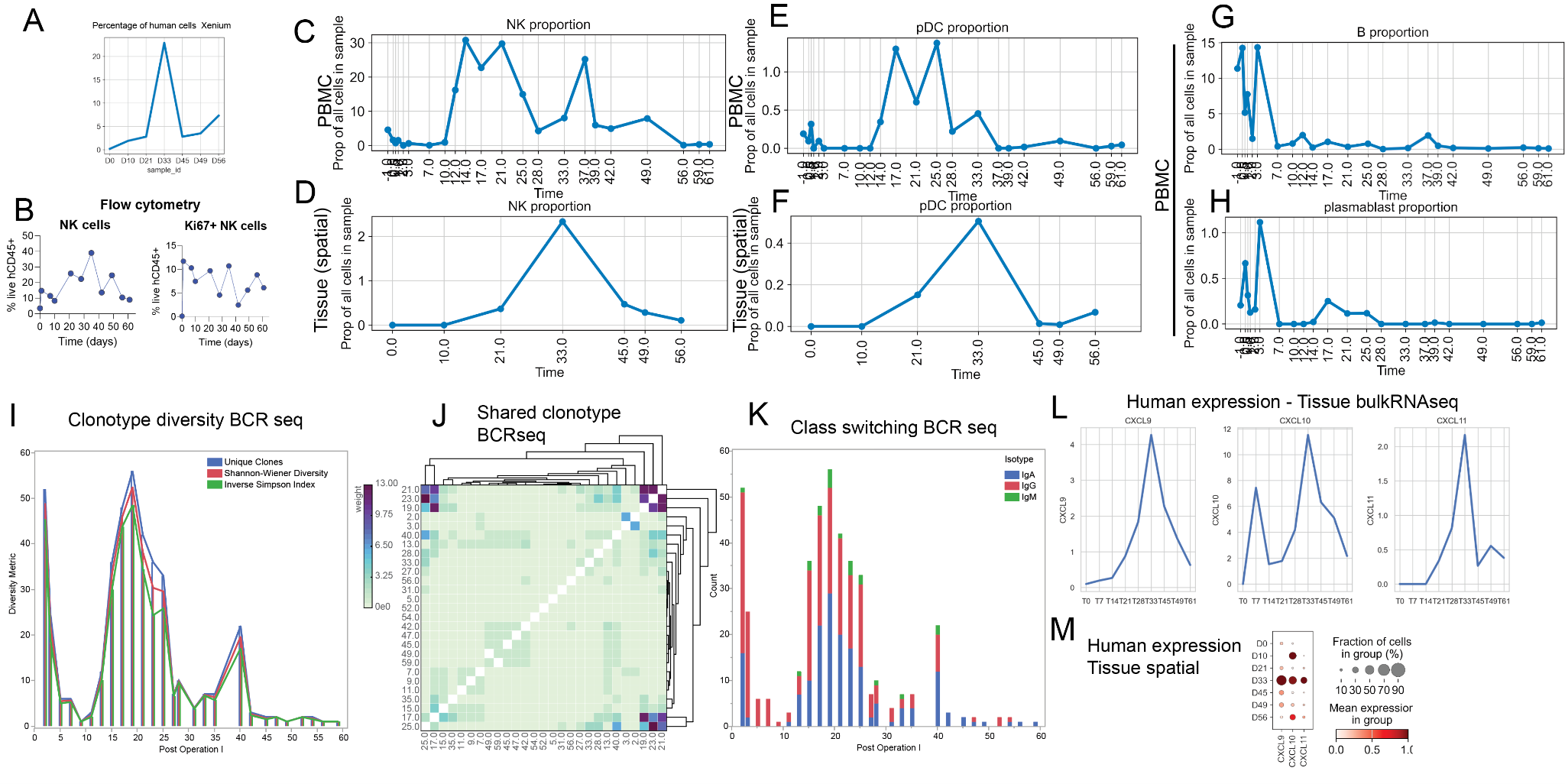 Figure 1: Early host immune cell response involving NK cells, pDCs and plasma / B cells. A. Percentage of human cells identified on the spatial transcriptomics Xenium slide, across all identified cells. B-D. Percentage of NK cells observed on B: Flow cytometry, C: PBMC scRNA-seq (out of all cells) and D: Spatial transcriptomics. E-F. Percentage of NK cells observed on E: PBMC scRNA-seq (out of all cells) and F: Spatial transcriptomics. G-H: Percentage of B cells (G) and plasmablasts (H) observed in PBMC scRNA-seq. I. Clonotype diversity from PBMC BCRseq J. Shared clonotypes across timepoints for PBMC BCRseq. L. Expression of human CXCL9, CXCL10, CXCL11 observed in the tissue bulk RNAseq. M. Expression of human CXCL9, CXCL10, CXCL11 observed in the tissue spatial transcriptomics.