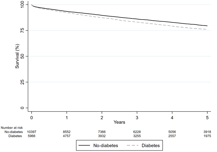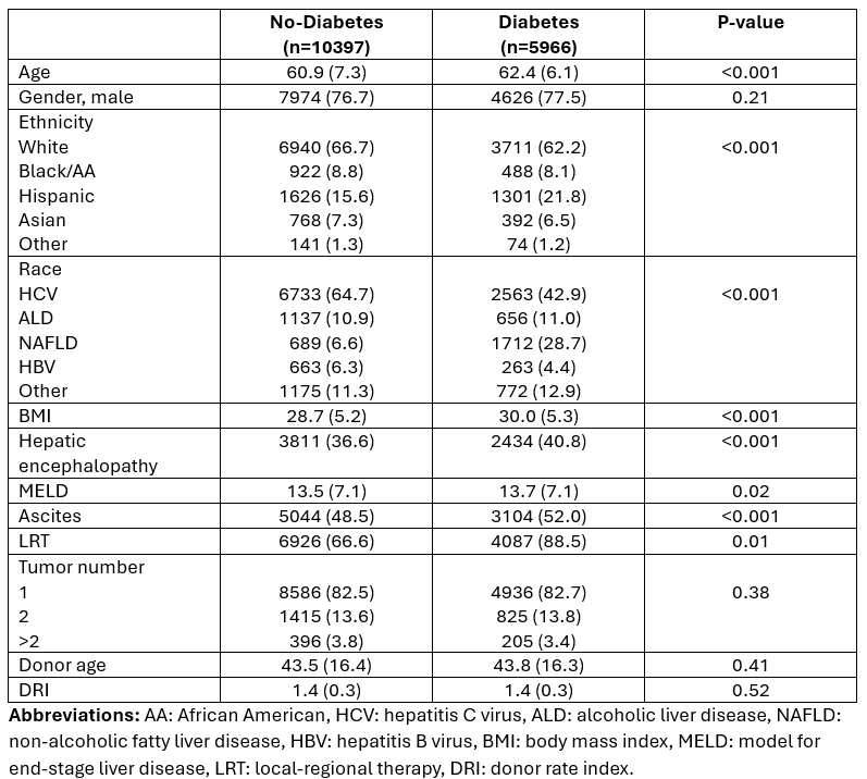 Results: We analyzed a total of 16363 HCC patients who underwent LT between Jan 2013 to December 2022. Among these 5966 (36.4%) patients had diagnostic codes for diabetes. The clinical characteristics of the two groups are shown in Table 1. Patients in the diabetic group were older and had higher BMI. The proportion of patients with MASLD was higher in the diabetic group (28.7% vs 6.6%). Survival in non-diabetic patients at 1, 3, and 5 years were 93.4%, 86.0%, and 79.4%, respectively; compared to diabetic group at 1, 3, and 5 years of 92.2%, 83.0%, and 75.9%, respectively (Figure 1). In univariate analysis, diabetes was associated with a higher hazard of mortality (HR=1.293, 95% CI 1.207-1.385). In the multivariate analysis, recipient age, race, pre-transplant dialysis, AFP, tumor number were associated with higher hazard of mortality. In addition, diabetes was associated with higher mortality (HR 1.210, 95% CI 1.128-1.297).