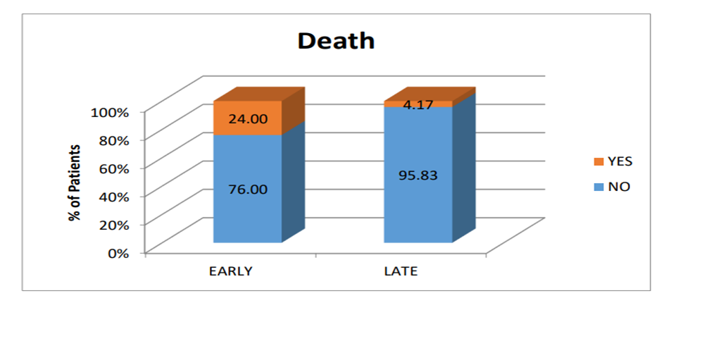 Results: Out of 25 patients of early initiative group, all had received Hemodialysis with 24% mortality and out of 28 patients of delayed initiative group, 86% received RRT with 4% mortality (p 0.047).