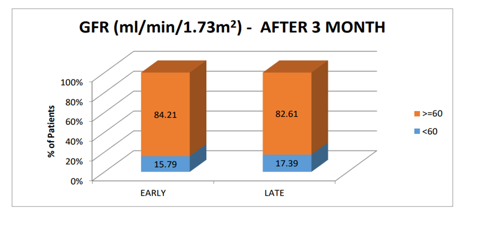 Mean proteinuria in patients given early RRT was 116.89 mg/day and in patients given late RRT was 143.57 mg/day after 90 days follow up (p=0.531).