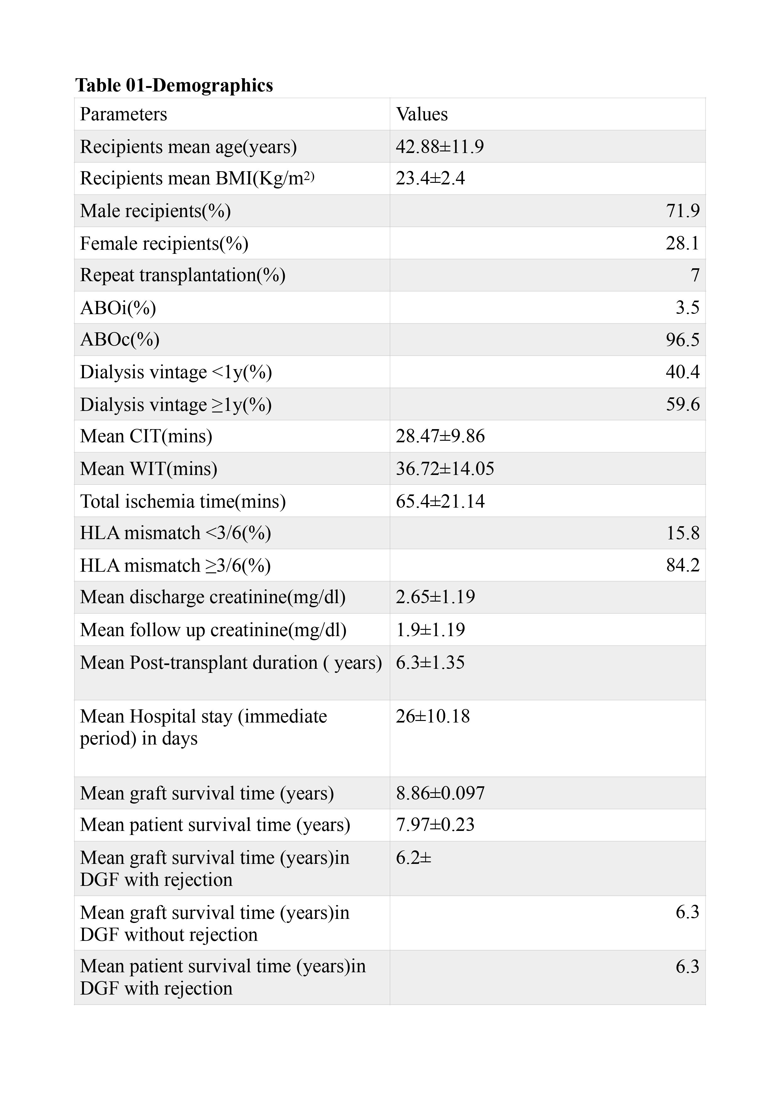 Results: 57 RTRs developing ATN were included . Male /female ratio was 2.56 :1.Mean age of recipients was 42.88 ±11.9 years. Mean warm ischemia time was 36.72 ±4.05 minutes, cold ischemia time was 28.47±9.86 mins and total ischemia time was 65.40 ±21.14 mins. Mean duration of hospital stay in the immediate post-transplant period was 25.82 ±10.2 days. Mean duration of follow up was 6 ±1.8 years. 84% of donors were female and mean age of donors was 43±8.5 years.12.3% of donors underwent right kidney nephrectomy and 87.7% underwent left kidney nephrectomy. 21.1% of donor kidneys had multiple arteries. Surgical site bleeding was seen in 29(50.9%) .17(29.8%)of recipients had acute rejections -12 in DGF and 5 in non-DGF group. 4(7%) developed chronic allograft nephropathy (CAN) – 3 in DGF and one in non-DGF group.18 (31.6%) developed infections –11 in DGF and 7 in non-DGF group. Patient survival was 75.4% at follow up and mean survival time was 7.98 years. Graft survival was 96.5% and mean graft survival time 8.86 years.12 patients (21.05%) developed DGF. Patient survival in DGF and non DGF group was 67% and 78% respectively.Graft survival in DGF and nonDGF group was 84% and 100% respectively (statistically significant).2 out of 12 DGF patients lost their graft. Significant association of DGF with CAN , infections and graft loss.