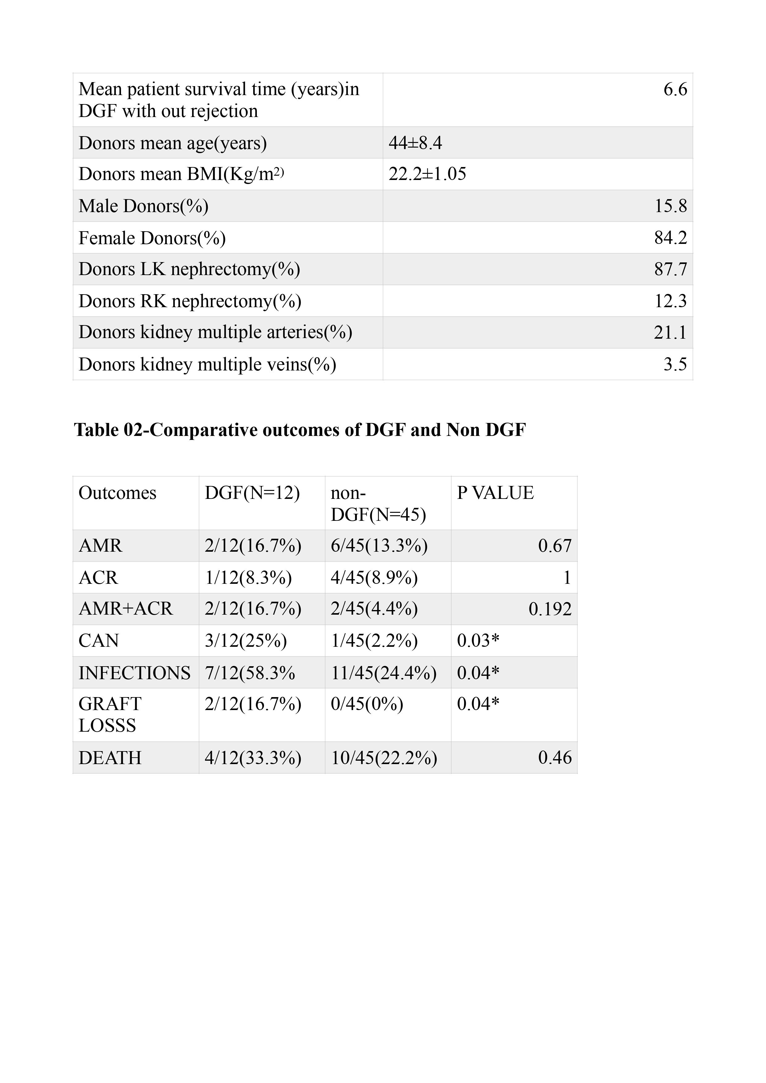 Methods: Study was conducted at a tertiary care center in Eastern India.RTRs who developed ATN (biopsy proven) from January 2013 to December 2017 were included in the study. Data of these patients & respective donors was collected. Minimum period of follow-up was 5 years post-transplant.Cold and warm ischaemia time, incidence of surgical complications, acute rejections, infections, graft survival , patient survival were noted. RTRs were followed up regularly in post transplant period with relevant investigations .The cohort was divided in two groups–DGF group and non-DGF group. A comparative analysis was done between the two groups. Data was analysed using SPSS version 26.