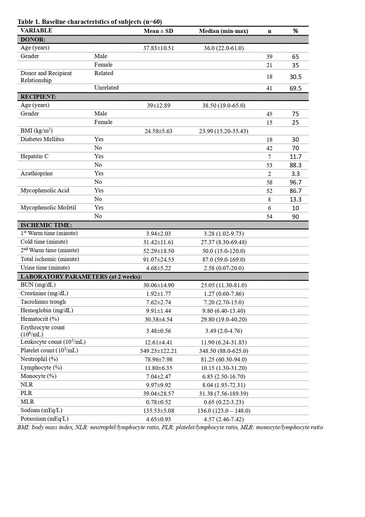 Methods: Retrospective cohort study of 60 adult patients who underwent KT with living kidney donors at Dr Sardjito Hospital, Indonesia. Several parameters related to recipient, donor, ischemic time and laboratory parameters were analyzed in this study. The cut-off values of Tacrolimus through, Monocyte-Lymphocyte Ratio (MLR), Netrophil-Lymphocyte Ratio (NLR), and Platelet-Lymphocyte Ratio (PLR) were assessed with receiver operating characteristic (ROC) curves. Predictor factor analysis used bivariate tests followed by multivariate tests.