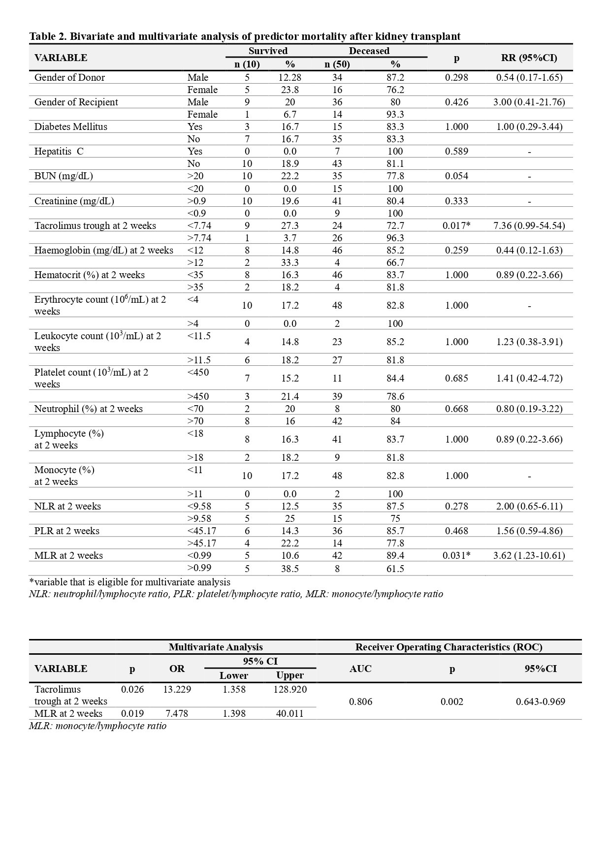 Conclusion: Tacrolimus trough levels <7.74 ng/mL and MLR > 0.99 at 2 weeks after KT can be predictors of mortality in kidney transplant recipients. MLR, a cheap and widely available parameter, is a reliable marker in predicting post-KT recipient mortality.