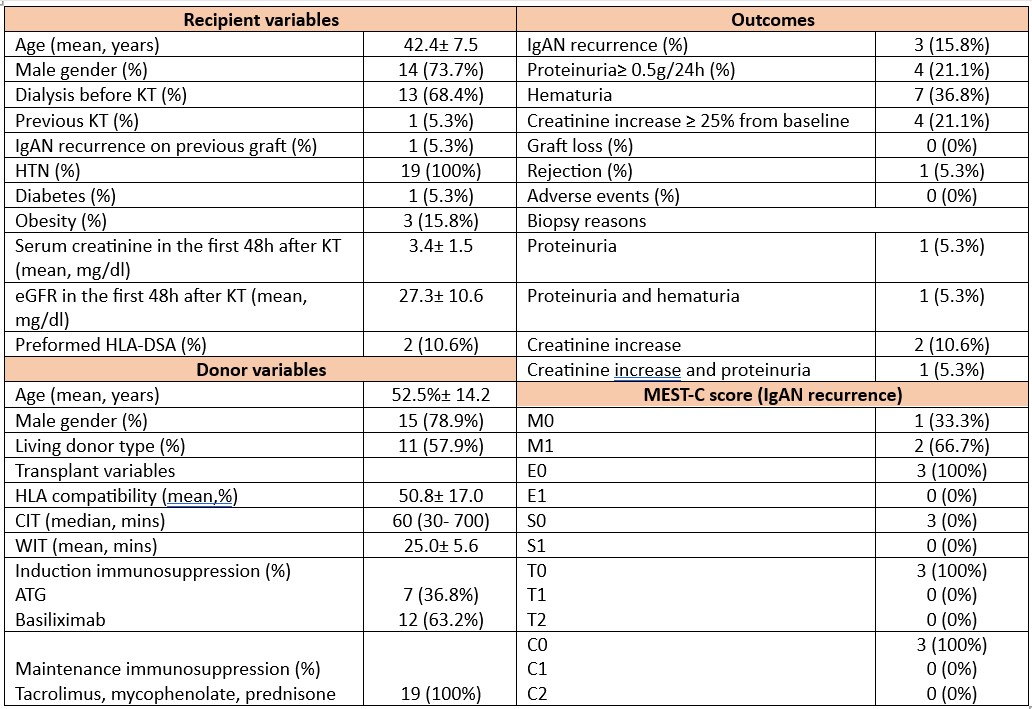 Methods: We performed a single-arm, open-label, prospective study of 19 adult KT recipients (KTR) with biopsy-proven IgAN on native kidneys, enrolled between 2021 and 2023. Median follow-up period was 15 months (10-22). All patients received 3mg of oral pH-modified release budesonide from day 45 after KT. Primary endpoint was clinically significant and biopsy-proven IgAN recurrence. Graft biopsy has been performed at indication. Secondary outcomes were: mean change of estimated glomerular filtration rate (eGFR) from baseline, proteinuria ≥ 0.5 g/24h, hematuria, creatinine increase ≥ 25% from baseline, incidence o graft loss, incidence of rejection and drug tolerability.