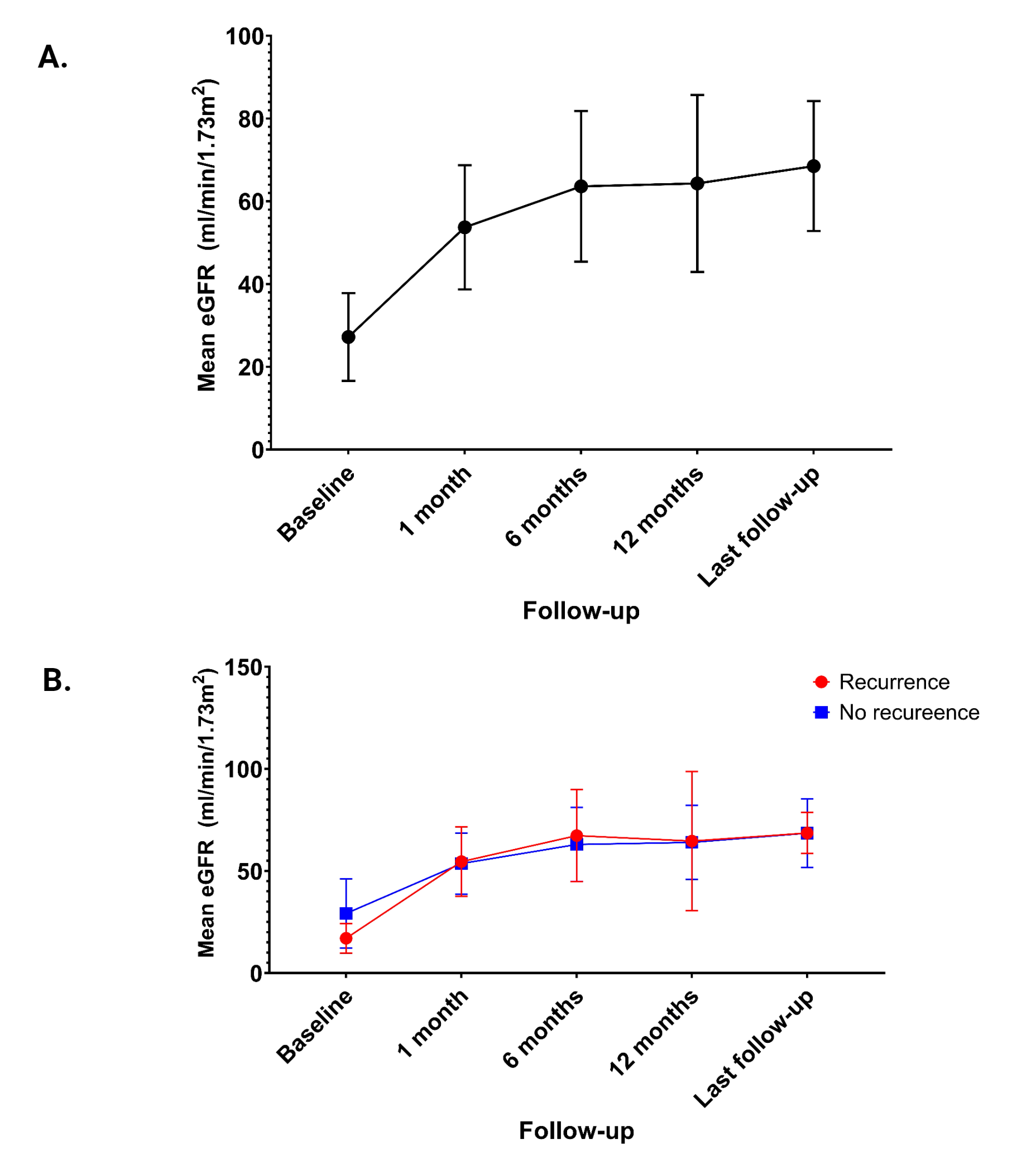 Conclusion: IgAN recurrence after KT occurred in 15.8% of patients under preventive treatment with oral pH-modified release budesonide. No difference regarding eGFR change was observed between patients with and without recurrence. None of the patients experienced any adverse events.
