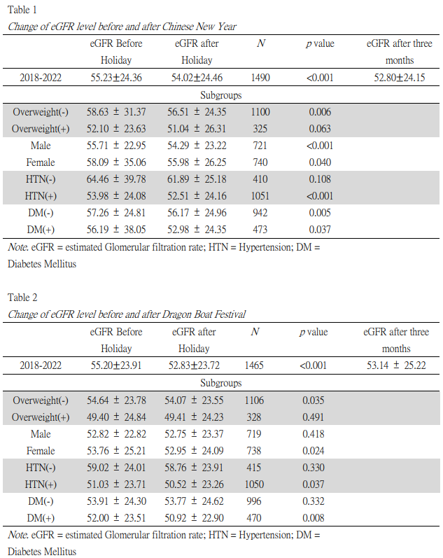 Introduction: We noted temporary increases in creatinine levels among kidney recipients following three traditional holidays in Taiwan. This retrospective cohort study aimed to examine the variations in eGFR levels after Chinese New Year, Dragon Boat Festival, and Mid-Autumn Festival, all linked to diets high in calories and fat.