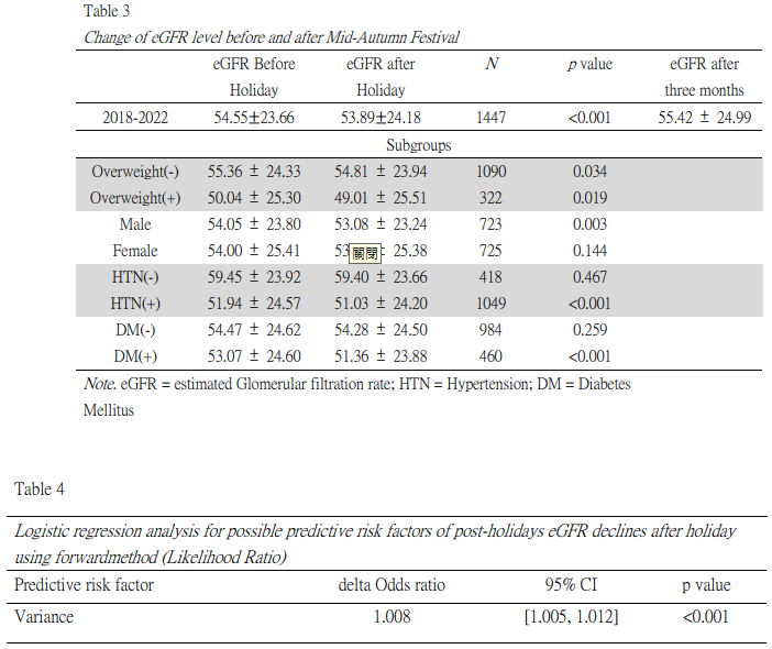 Method: We conducted a retrospective analysis of 364 kidney recipients with stable graft function who were following at Chang Gung Memorial Hospital Linkou from 2018 to 2022. The graft function before and after the festival was determined by calculating the eGFR level using the serum creatinine measured during clinic visits prior to and following the festival. The patients were then categorized into subgroups based on their gender, BMI, and co-morbidities. The eGFR levels before and after the festival were evaluated and compared within these subgroups. A multivariable analysis was employed to examine potential risk factors, including age, gender, BMI, and co-morbidities, and eGFR variance before the holidays, which may influence the decline in kidney function following the holiday period.