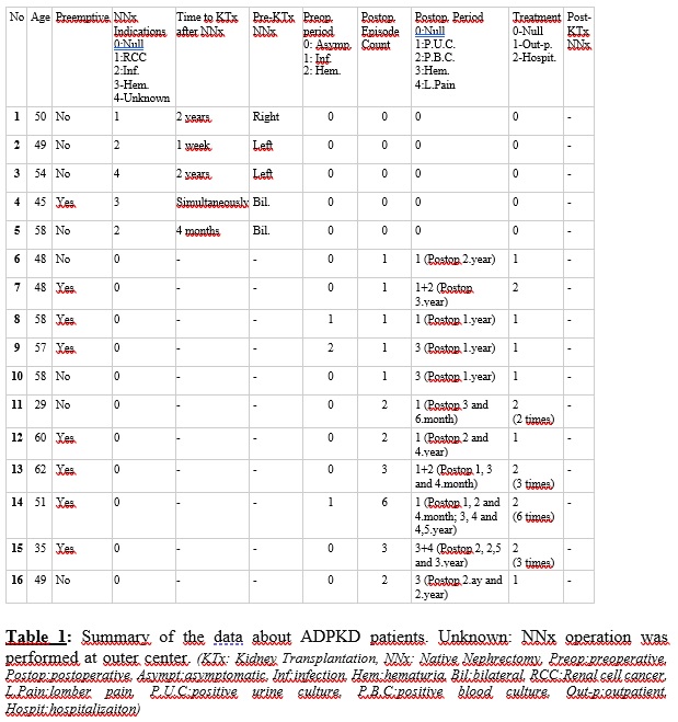 Method: We retrospectively evaluated adult patients with ADPKD who underwent KTx between 2018 and 2023 at our institution. Data regarding the timing and techniques of NNx, postoperative complications, patient and graft survivals were collected. Patients were assessed for a history of recurrent urinary tract and/or severe cyst infections, hematuria, complications secondary to the mass effect of the polycystic kidneys and other NNx indications before and after KTx. Preoperative and postoperative-if available- dimensions of the polycystic kidneys in the CT scan were reported.