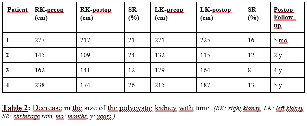 Results: Among 566 KTx performed, 39 were due to ADPKD. There were 21 female (48%) and 22 male (52%) patients, with an average age of 51.6±8.6years, and with an average BMI of 27.5±5.6. Preoperatively, 5 (12%) of the patients experienced frequent urinary tract and/or severe cyst infections, and 2 (5%) had hematuria episodes. 5 patients underwent NNx. 3 patients had unilateral and 2 had bilateral NNx. One patient had a simultaneous bilateral NNx with KTx due to recurrent hematuria and all the others underwent NNx prior to KTx at intervals ranging from 4 months to 2 years due to cyst infection, recurrent nephrolithiasis, and renal cell carcinoma. There was no indication of mass effect or to create space for KTx in the etiology of NNx (Table 1). The average length of the right and the left kidneys were 185±42cm and 183±40cm, respectively. During postoperative follow-up, CT scans performed in 4 patients for cause revealed a reduction in the size of the polycystic kidneys (Table 2). Postoperatively, the average hospital stay was 7.56±5.7days, with a median outpatient follow-up of 2 (range: 0.1-4.5)years. One patient died in the 4th postoperative year due to COVID pneumonia.