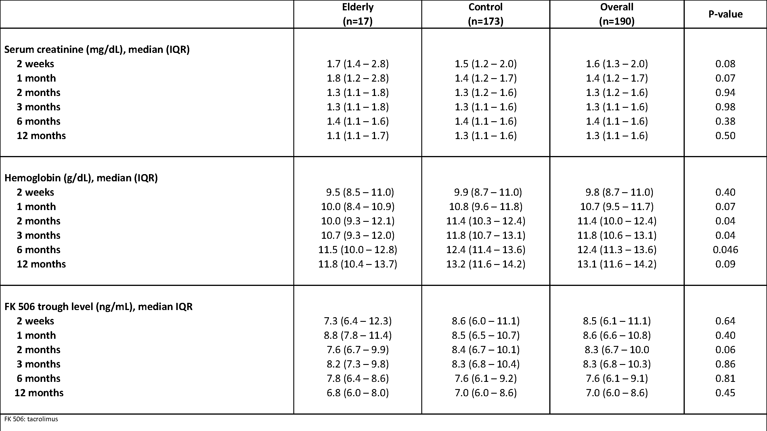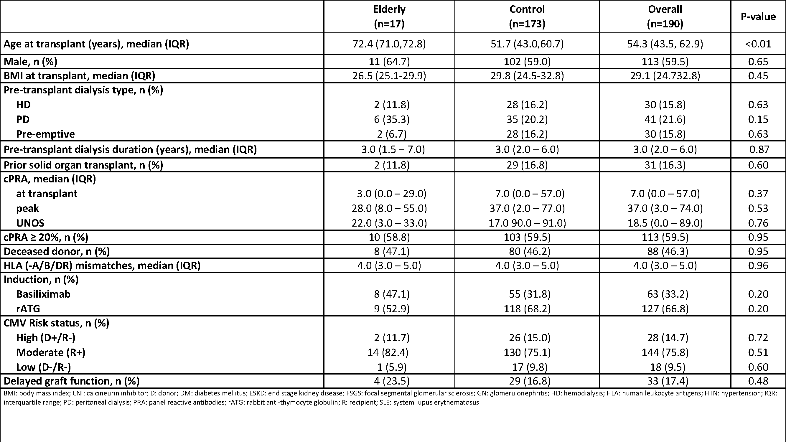Results: 190 patients were analyzed during the study period. Of these, 17 patients were ≥ 70 years old at the time of transplant. Baseline characteristics, aside from age, were similar between groups.