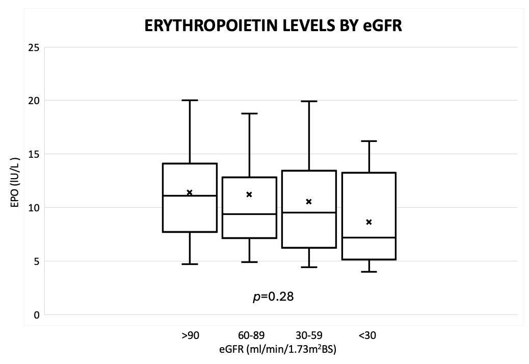 There was a correlation trend but without statistical significance between Hb and serum EPO levels (p=0.051), but not between EPO levels and eGFR (p=0.28). Furthermore, we demonstrate an inverse correlation between the creatinine level and the EPO levels (p<0.001).