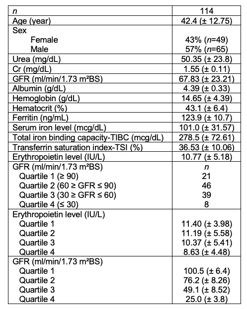 Method: Observational, analytical, transversal and prospective study from January 2021 to February 2023. Were included all G5 KDIGO chronic kidney patients who completed 3 years post-transplant during the study period at Central Military Hospital, Mexico, City. All subjets were divided into 4 subgroups according to their GFR. Serum iron kinetics and erythropoietin levels were determined. Exclusion and elimination criteria were: subjects denied informed consent, those patients with digestive tract bleeding and subjects with erythropoietin use. The Kolmogorov-Smirnov test was performed to determine the normality of the variables, data was reported as median and interquartile range (IQR); descriptive and analytical statistics were performed with Xi², Kruskal Wallis test and ANOVA tests. p< 0.05 was statistically significant.