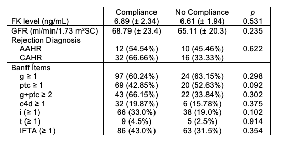 Discussion:  Our results are similar to reported in 2019 by Al-Sheyyab A et al, where 39% were non-compliance and there weren´t differences in the presence of antibody-mediated rejection between both groups, but his adherent group had a higher IFTA. Lerut E et al concluded that non-adherent patients have greater interstitial infiltrate (p=0.0100), interstitial fibrosis (p=0.0277) and tubular atrophy (p=0.0197); similar results found by Cardoso, BD: non-adherent group had higher IFTA (95% CI 15.16-20.53) (p = 0.015).