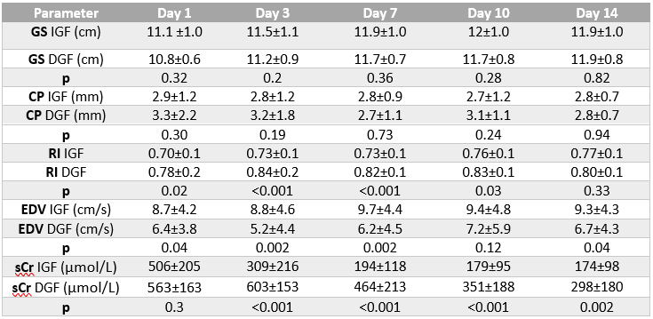 Methods: A total of 123 consecutive patients who received a kidney transplant between August 2015 and September 2018 were included in the study. Exclusion criteria were primary graft nonfunction, graft failure or death early after transplantation. In addition to the daily blood tests, daily Doppler-US examinations were performed on working days during the first 14 post-operative days. Serum creatinine (sCr), bipolar graft size (GS), cortical perfusion (CP), end diastolic velocity (EDV), and resistive index (RI) were compared between the IGF and DGF patient groups.