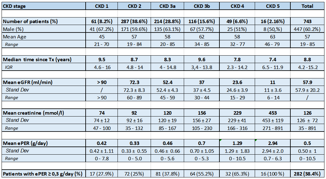 Results: At the end of 2021, there were a total of 743 adult patients with a functioning kidney graft (including 52 patients transplanted in the same year). The majority of patients were male. Almost half of all patients (46.8%) had CKD stage 1 or 2 with near-normal kidney graft function (eGFR ≥ 60 ml/min). Kidney transplant recipients with advanced CKD (stages 4 and 5) represented a minority of patients (8.8%). The estimated protein excretion rate (ePER) increased gradually with CKD stage. The median time since transplantation was almost 9 years in all groups (Table 1).