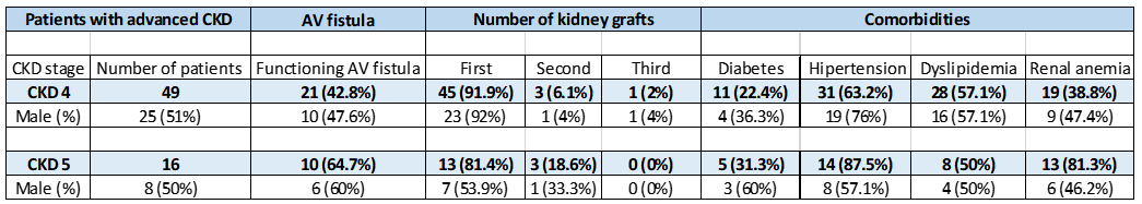 There were 65 patients with advanced CKD; for the majority (89%) this was the first kidney graft. Functional arterio-venous (AV) fistula was present in almost half of them and in approximately two-thirds of patients with stage 5 CKD. Among comorbidities, hypertension was present in 45 (69%), diabetes in 16 (25%), dyslipidemia in 36 (55%) and renal anemia in 32 (49%) (Table 2).