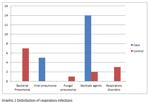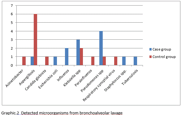 Results: A total of 32 patients, 19 BAL CMV PCR positive transplant recipients (case group) and 13 BAL CMV PCR negative organ recipients (control group) were enrolled to the study. Most of patient in case group (68,4%) was defined probable CMV pneumonia. CMV IgG seropositivity was higher in case group (68,4%). Respiratory symptoms at admission were high in control group (46,2%). Bronchoscopy indication was based on both of clinical symptoms and radiological findings in both group (68,4% in case to 53,8% in control ). The rate of fever on admission was low in both groups. (53,8% in case to 23,6% in control). Platelet count and lymphocyte rate were significantly lower in the case group, but were not statistically significant. The coinfections at the same time of BAL were higher in the case group (57,9% to 15,4%; p=0,02). Graphic 1 shown distribution of respiratory infections and graphic 2 shown detected microorganisms of BAL. Bacterial agents were the most frequently detected microorganisms from BAL in both groups. Only one CMV pneumonia patient was taken rejection therapy within 3 months before diagnosis of IPA. 30-day mortality was found 63,2% in CMV pneumonia group, 38,5% in control group.