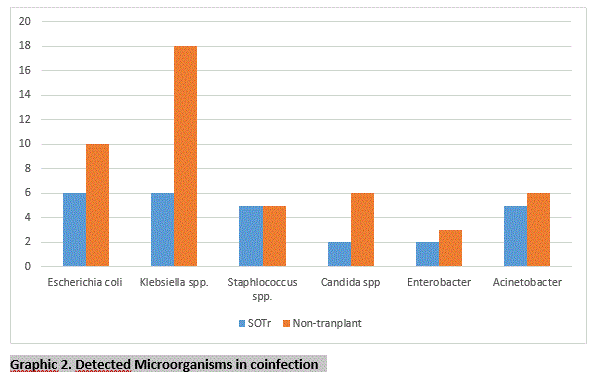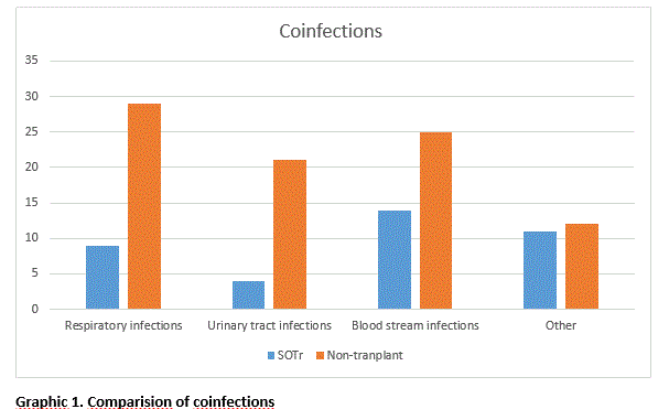 Results: The study included 199 patients, with 40 (20.1%) being SOTr. In both groups, the majority were male (67.8%) and inpatients (86.4%). The median age was higher in the non-transplant group (72; p<0.001). Respiratory symptoms at admission were high in both group (92%). Chest CT signs were higher in SOTr than non-transplant , but not statistically significant (72.5%; 57.5%, respectively). Aspergillus spp. was the most frequently detected mold type in all group (85.7%). Before the diagnosis of IPA, antibiotic usage was high (75.9%), and previous ICU stay was 43.7% in all group. Coinfections were detected in both groups, with higher rates in SOTr (67.5%; p=0.006). Graphic 1 displays the distribution of coinfections. Bloodstream infections (BSIs) and respiratory tract infections were the most common coinfections in SOTr, whereas BSIs and urinary tract infections were most common in non-transplant. Enterobacterales were the most common detected microorganisms in coinfections, as shown in Graphic 2.