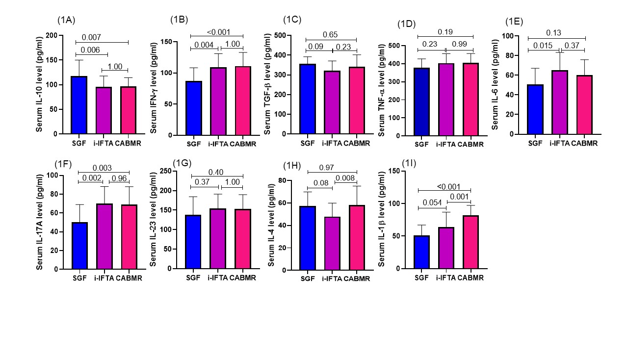 Results: The fold change in Th1 cell transcription factor T-bet expression in SGF vs CABMR group was (1.17±0.59 vs 2.84±1.34au; p<0.001), SGF vs i-IFTA was (1.17±0.59 vs 2.22±1.02 au; p=0.009). The fold expression of Th2 cell TF GATA-3 in the SGF vs CABMR group was (1.05±0.14 vs 1.18±0.82au; p=1.0), SGF vs i-IFTA was (1.05±0.14 vs 1.65±0.62au; p=0.016). The fold expression of Th17 cell TF RORC in SGF vs CABMR was (1.14±0.31 vs 2.33±0.95au; p<0.001), SGF vs i-IFTA (1.14±0.31 vs 2.00±0.70au; p=0.002) and regulatory T cell transcription FoxP3 expression in SGF vs CABMR was (1.01±0.065 vs 1.86±0.85au; p=0.002), SGF vs i-IFTA was (1.01±0.065 vs 2.26±0.91au; p<0.001). The ratio of T-bet/FoxP3, GATA-3/FoxP3 and RORC/FoxP3 TF expression in SGF vs CABMR and i-IFTA group was similar and statistically not significant among the group. However, in i-IFTA vs CABMR, the ratio of T-bet/FoxP3 (1.13±0.71 vs 1.79±1.19, p=0.011), and RORC/FoxP3 (1.01±0.49 vs 1.59±1.07; p=0.01) was significantly higher in CABMR group. The absolute serum level of cytokines IFN-ɣ, IL-17 and IL-1β was significantly higher in the CABMR and i-IFTA group compared to SGF {{AbstractFigure.1a-i}}. Whereas, the ration of IFN-ɣ/IL-10 in SGF vs i-IFTA vs CABMR (0.83±0.37 vs 1.20±0.35 vs 1.19±0.38; p<0.05), IL-17A/IL-10 (0.50±0.31 vs 0.71±0.25 vs 0.65±0.22; p<0.05), IL-1β/IL-10 (0.49±0.27 vs 0.70±0.26 vs 0.88±0.23; p<0.05) was significantly higher in i-IFTA and CABMR group respectively.