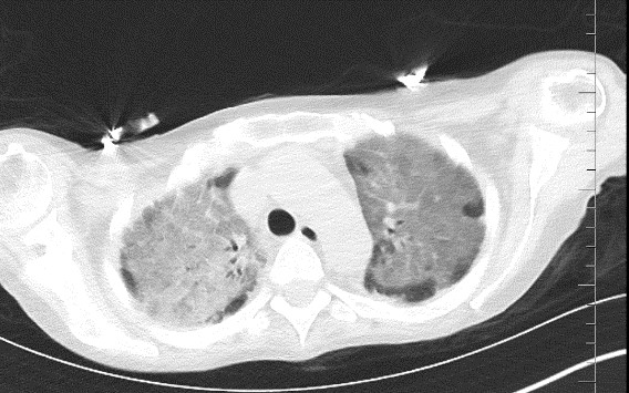 Serum galactomannan antigen test taken on the 2nd day of ICU hospitalization was found 0.65 S/CO but not was considered significant. Thorax CT scan performed on 18/01/24 revealed consolidation areas especially in the upper lobes and diffuse infiltration areas which were evaluated in favor of viral pneumonia in the foreground, and ARDS should be considered in the differential diagnosis (Figure 1).