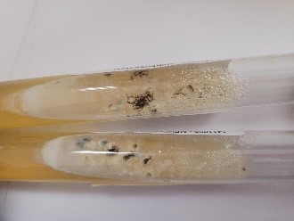 On 22/01/24, fiberoptic bronchoscopy was performed, galactomannan antigen, CMV PCR and Influenza PCR tests were found positive in bronchoalveolar lavage. After fiberoptic bronchoscopy, the patient's condition worsened, she was intubated . Amphotericin B, Meropenem 2x1 gr and Colistin treatments were initiated upon XDR E.coli growth in the culture samples sent from bronchoalveolar lavage. Aspergillus niger growth was observed in fungal culture (Figure 2).
