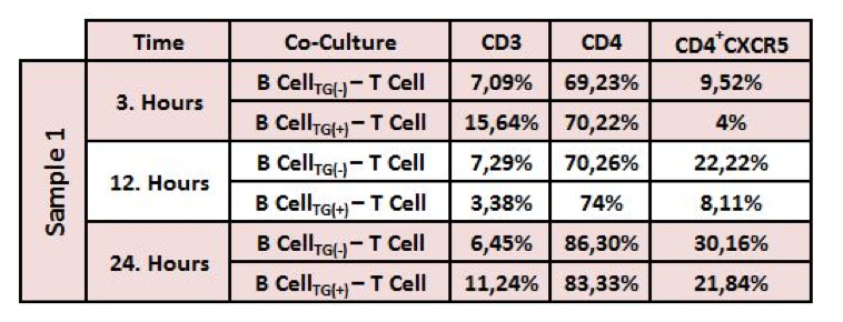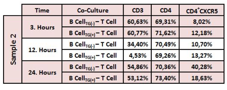 Results: It was determined that CXCR5 expression decreased on the surface of T cells co-cultured with ER stimulated follicular B cells, especially at 24. hour. HLA-DR expression decreased on B cells treated with tapsigargin. CD4+ T cell, CD19+B and the other cell surface molecule expression did not change depending on TG and time (table 1 and 2).