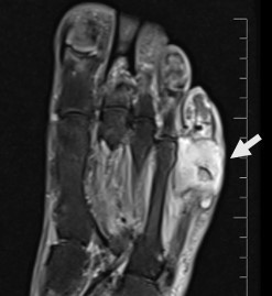 Case: A 65-year-old male patient with a history of kidney transplantation 10 years ago was admitted to outpatient clinic for erythema and edema on the dorsum of his left foot. He had no history of trauma. He was diagnosed with cellulitis due to leukocytosis and elevated CRP levels with his symptoms, and subsequently got oral antibiotic therapy. One week after the redness subsided, the discomfort intensified and CRP levels elevated further. Foot MRI has been performed and osteomyelitis in his fifth mettarsal bone has been investigated (figure 1). An MRI of the foot was conducted to evaluate osteomyelitis in the fifth metatarsal bone. Following a further 6 weeks of intravenous antibiotic treatment, a fistula developed, leading to a debridement surgery for sampling. Cryptococcus neoformans serotype A was isolated from bone tissue culture and treatment with fluconazole was initiated. A nodular lesion was observed in his chest CT scan despite the lack of respiratory symptoms (figure 2). There were no neurological symptoms or meningeal involvement observed in the cranial MRI, nevertheless, a lumbar puncture was conducted. A positive Cryptococcus neoformans latex agglutination test was detected in the cerebrospinal fluid analysis, requiring a change in his antifungal treatment to liposomal amphotericin B for disseminated disease involving central nervous system. During the same week, prostate imaging was conducted due to urinary retention, and an abscess was examined. Cryptococcus neoformans serotype A was cultured from the abscess after it was drained. Following a 4-week course of Liposomal amphotericin B treatment, antifungal medication was changed to fluconazole and continued for 12 months until full recovery and no complications or immune reconstitution inflammatory syndrome (IRIS) occurred, although a urinary tract infection developed during the therapy.