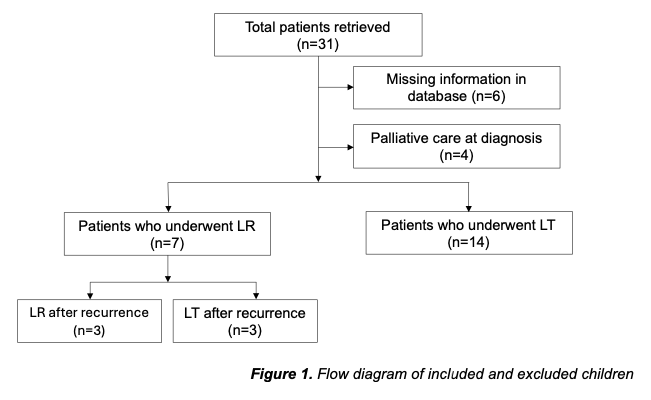 Methods: A total of 25 patients were retrieved, 4 of whom were classified as palliative at diagnosis. A subanalysis comparing cirrhotic liver (n=14) vs de novo (n=11) HCC was performed to identify confounding variables. Further evaluation focused on the 21 children with histologically confirmed HCC who underwent LR (n=7) vs LT (n=14). Kaplan-Meier survival curves were constructed.