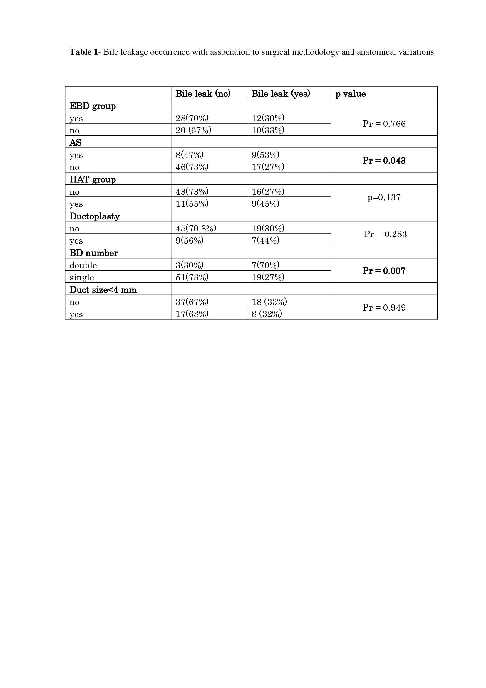 We found that BCs comprised the most frequent complication in our case series. Bile leakage was significantly associated with AS development, moreover AS occurred more frequently in EBD group. Limitation of our study included small patient number. However, placement of EBD appears to be a good choice for AS prevention.