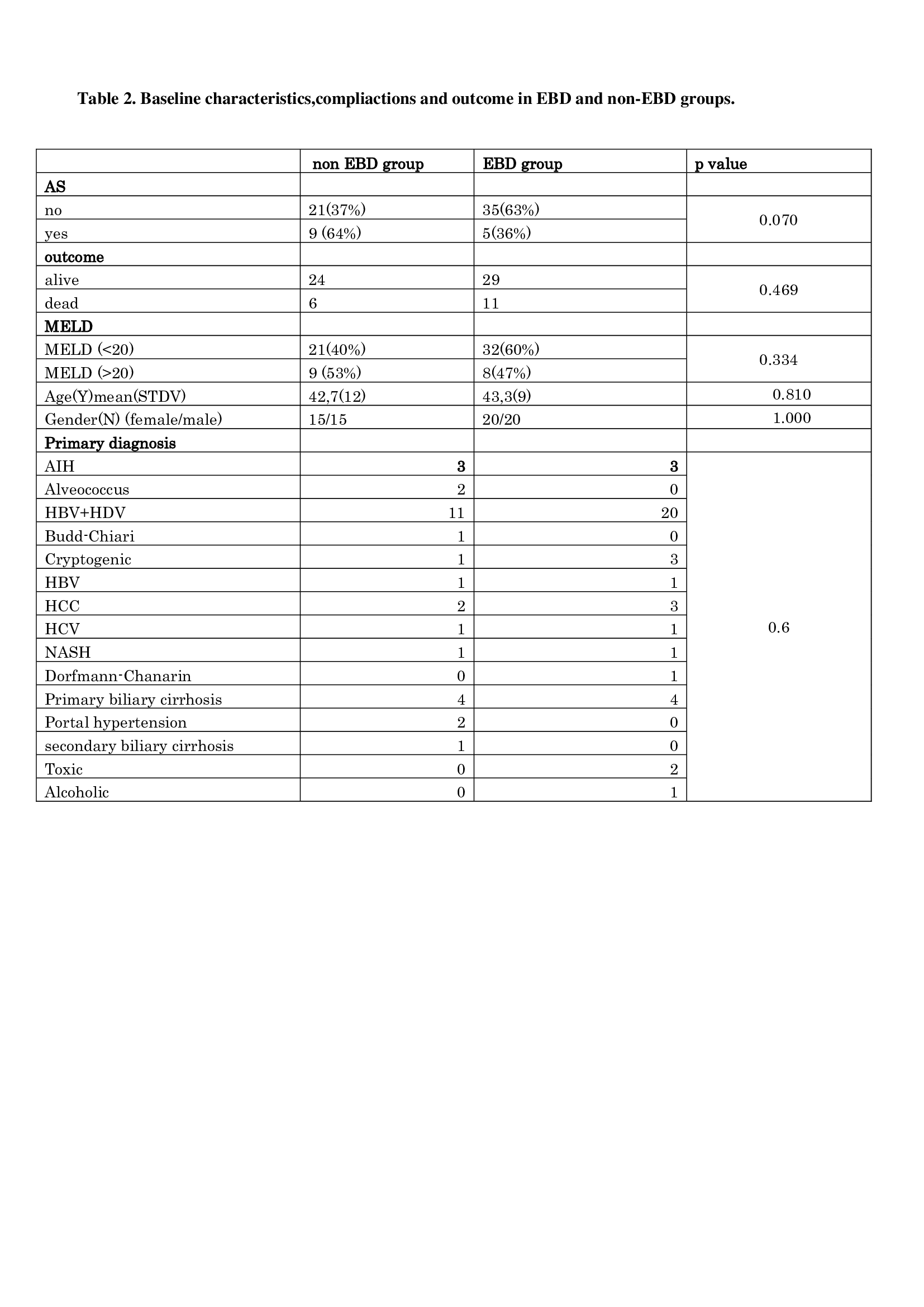 Overall survival was analyzed in group with and without EBD group,1,3,5 year survival was 83% for all years and 73% in non-EBD and EBD group respectively, showing no statistical difference (p value-0.39). HAT occurrence was significantly associated with the death of the recipient, p value- 0.0000.