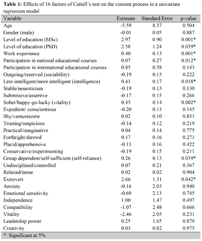 Method: This analytical study was conducted on 99 coordinators from 56 transplant organ procurement units in Iran. Basic information including age, education, activity history and attendance of coordinators in national and international training courses, were registered. The family consent rate for each coordinator was determined by defining the ratio of the number of successful consents to the total number of brain death cases that were referred to them. Also, the Cattle test 16-factor psychological was performed on all coordinators to determine characteristics such as extroversion or introversion. Then, the effect of each 16 psychological factors besides basic information were investigated on the success of the coordinators on obtaining family consent. Due to the large number of explanatory variables, linear penalized regression model was applied to effect estimation. Significant level was considered, 0.05 for the model.