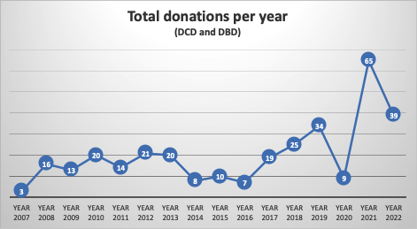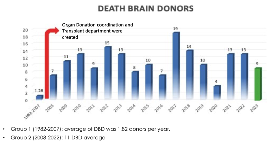 Results: from 1982 to 2007 the average of DBD in our hospital was 1.82 donors per year. In 2008, when a transplant department and organ donation coordination were created, number of donors raised up to 7 donors and constantly did for the next years. In 2012, appeared by the first time ranked in the top 5 hospital with most DBD in whole country and over the last 10 years, the hospital has appeared 7 times in this list, being 2nd place three times in 5 years. In 2021, death donor rate was 17.2 pmp. Since 2008, we have had 170 DBD, median age 39.5 years, 68 % were male and 32% female.