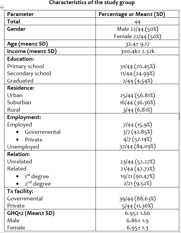 Results: The mean age of the participants was 32.4± 9.17 years; 50% (22/44) were males, and the majority (70.45%) received primary school education. More than half of the study sample lived in an urban area (56.81%), and the majority (84.09%) were unemployed. Fifty-two percent of the donors were willing to donate to an unrelated recipient. Governmental hospitals are where these donors will donate their kidneys (88.63%). The mean GHQ12 was 6.95± 1.66; the mean GHQ12 score for males was 6.86 ± 1.9, and for females, 6.95± 1.3. There is no statistically significant difference between the two groups and no statistically significant difference in the GHQ12 mean between the donors who will donate to related or unrelated recipients.