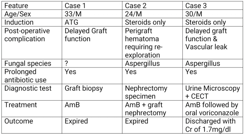 Method: Case 1: 33-year old male with ESRD underwent renal transplant with mother as the donor with ATG induction. He developed allograft dysfunction on postop day 4.Urine culture revealed pseudomonas growth, and he was initiated on antibiotics. He developed lymphocele, leading to graft HDN and bladder compression. Deroofing surgery was performed. Persistent renal dysfunction prompted a graft biopsy, which confirmed fungal pyelonephritis. Am B therapy was subsequently commenced. A percutaneous nephrostomy was placed for persistent HDN, but there was no improvement in graft function. Patient ultimately succumbed to sepsis with shock. Case 2 - A 24-year old male with ESRD underwent renal transplant with father as donor with steroid induction. He was discharged at 3 weeks with creatinine levels of 0.8 mg/dL. DJ stent was removed at 5th week. Two days later, he developed high-grade fever, graft dysfunction, and pancytopenia. Urine culture grew pseudomonas. Despite antibiotics, fever persisted and antifungal therapy was initiated empirically. Graft nephrectomy was performed secondary to persistent sepsis with DIC. Graft specimen revealed invasive aspergillosis on histopathology. The patient did not improve despite therapy ultimately succumbing to septic shock. Case 3- 30 year old male, underwent renal transplant with brother as donor, with steroid induction. His urine output decreased on day 1 post op. Graft biopsy showed antibody mediated rejection and was started on plasmapheresis. On day 9, he developed a delayed vascular anastomotic leak for which he underwent re-exploration. Later his graft function started improving. 4 weeks after transplant he developed UTI with Klebsiella growth on urine culture. His DJ stent was removed and antibiotics were started and he improved. 6 weeks after transplant, he again developed fever with passage of fleshy material in urine. CECT KUB showed papillary necrosis. Because of persistent fever, he was empirically started on antibiotics and antifungals. His urinary debris showed fungal elements. He received Am B for 3 weeks and was discharged on oral antifungals with a creatinine of 1.7 mg/dl.