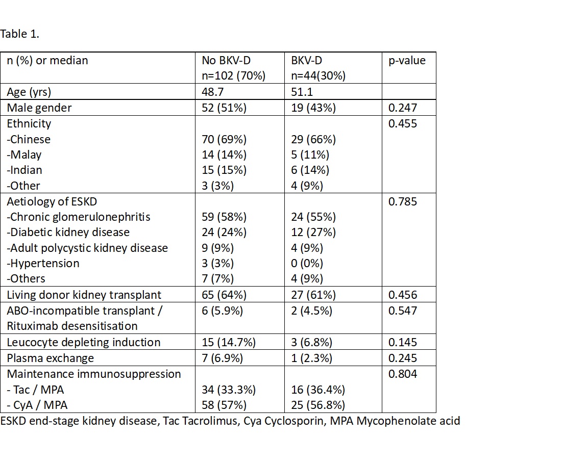 Methods: In this single-centre, retrospective cohort study we analysed 146 KTRs transplanted between 1-Apr-2019 and 31-Dec-2023. BK DNA levels were screened at monthly intervals post-transplant from months 1-9, then 3-monthly until 24-months post-transplant. Management of BKV-D consisted of halving of anti-metabolite dose followed by cessation, and institution of HDIVIG at 2g/kg every 4-6 weeks for BKV-D > 3log, followed by conversion to mTOR-inhibitors(mTORi), cessation of calcineurin inhibitor(CNI) or other adjunctive therapy. Allograft biopsy was performed in cases of allograft dysfunction. Outcomes of KTRs with BKV-D were manually abstracted from case records.