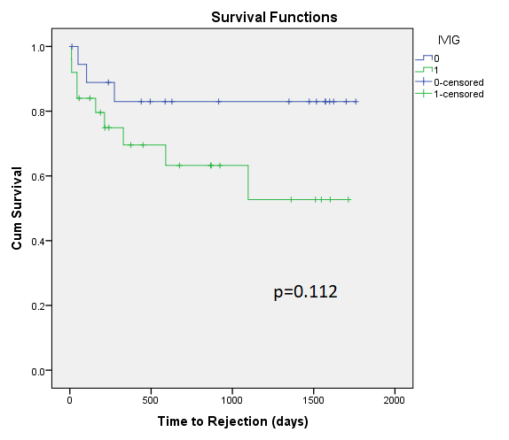There were no significant differences in demographics, induction or maintenance immunosuppression in KTRs who developed BKV-D vs those who did not. Mean time to detection of BKV-D was 93 days post-transplant (range 26 – 644 days), with time to peak BKV-D noted at 125 days post-transplant. Antimetabolite was stopped in 19(43%), mTORi was commenced in 9(20%), 4 cases received leflunomide and 2 cases had cessation of CNI. 25 KTRs (56%) received HDIVIG. KTRs who received HDIVIG had higher peak BKV-D (4.54log vs 2.98log, p<0.05). KTRs with higher peak BKV-D were more likely to have cessation of anti-metabolite and develop AR. HDIVIG did not significantly affect risk of AR(Fig.1)