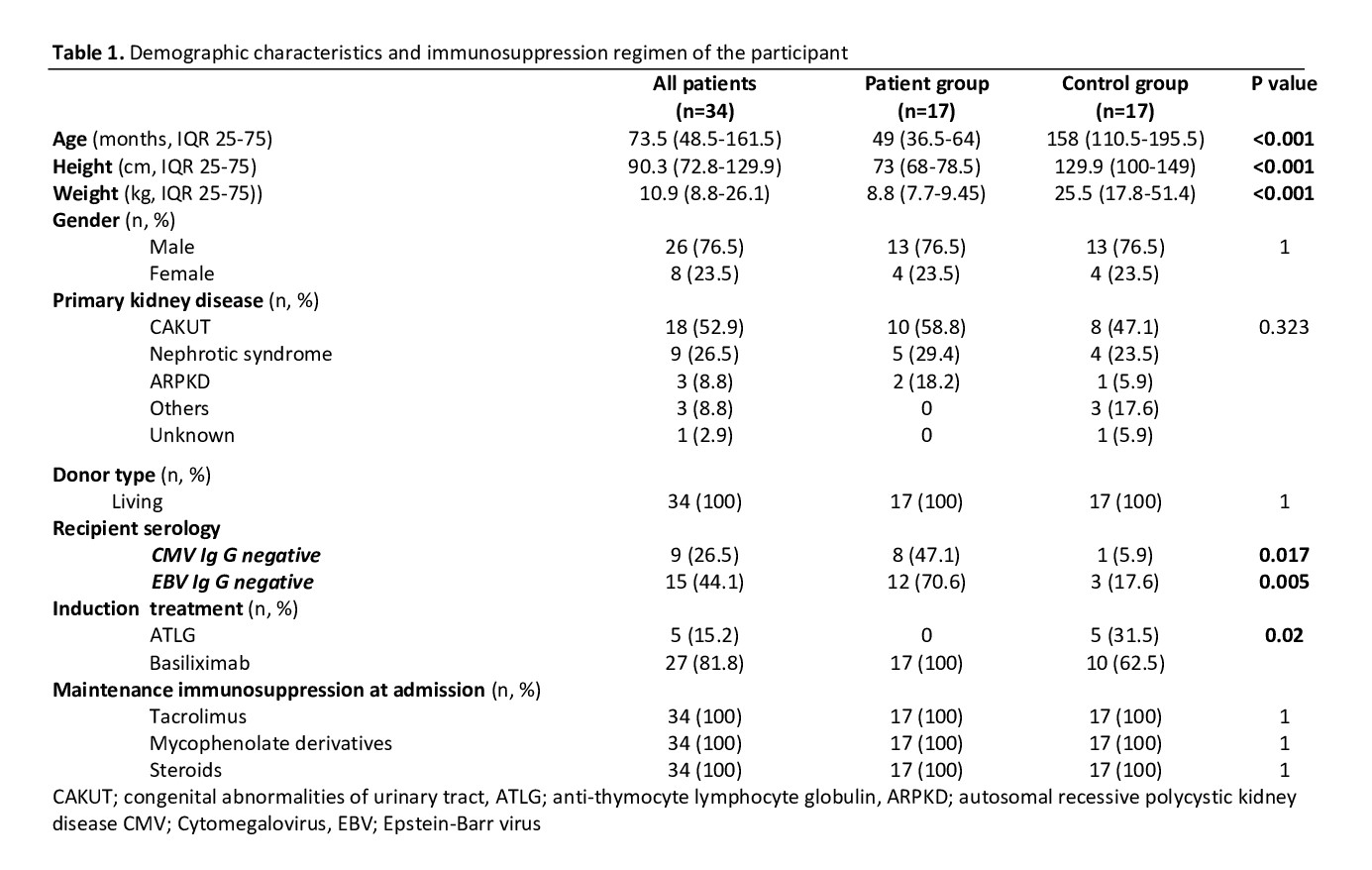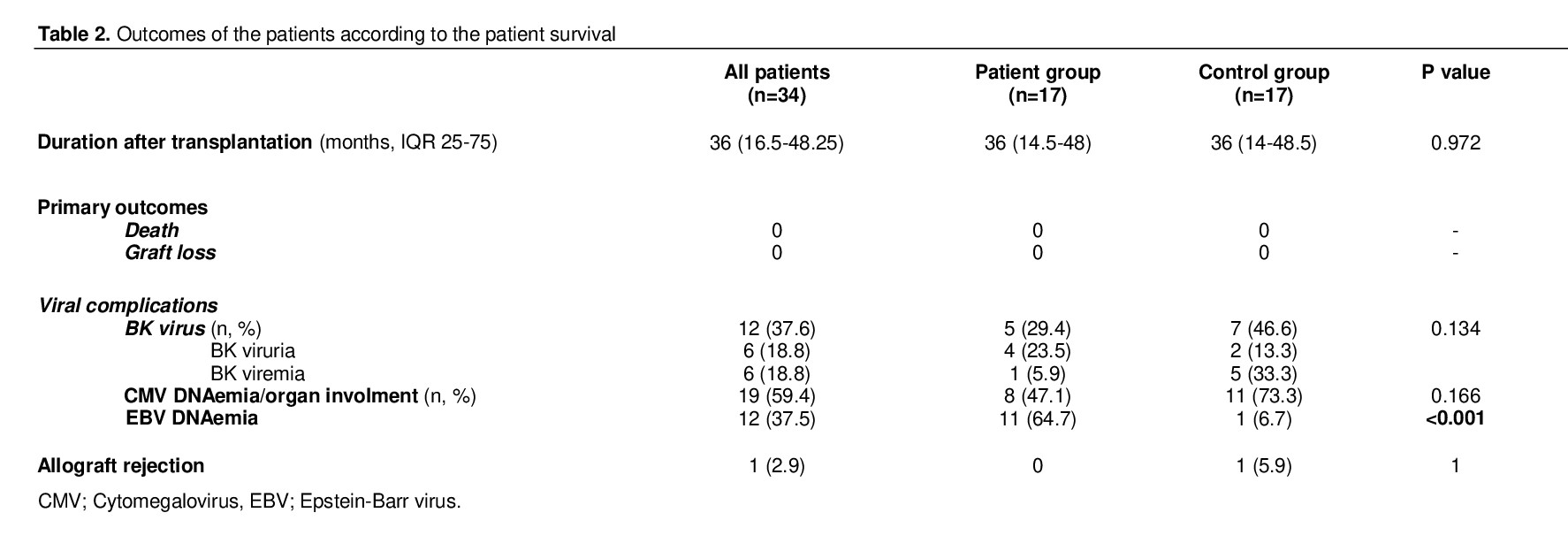 Results: Thirty-four kidney transplant recipients were followed for a median of 36 months after transplantation. Although, there were no statistical differences in both groups in terms of BKV (5 vs. 7; p=0.134), CMV infections (8 vs. 11; p=0.166); EBV DNAemia (11 vs. 1; p<0.001) were common in the patient group than the control group. EBV-related Post tx lymphoproliferative disease (PTLD) occurred in 2 children in the patient group.