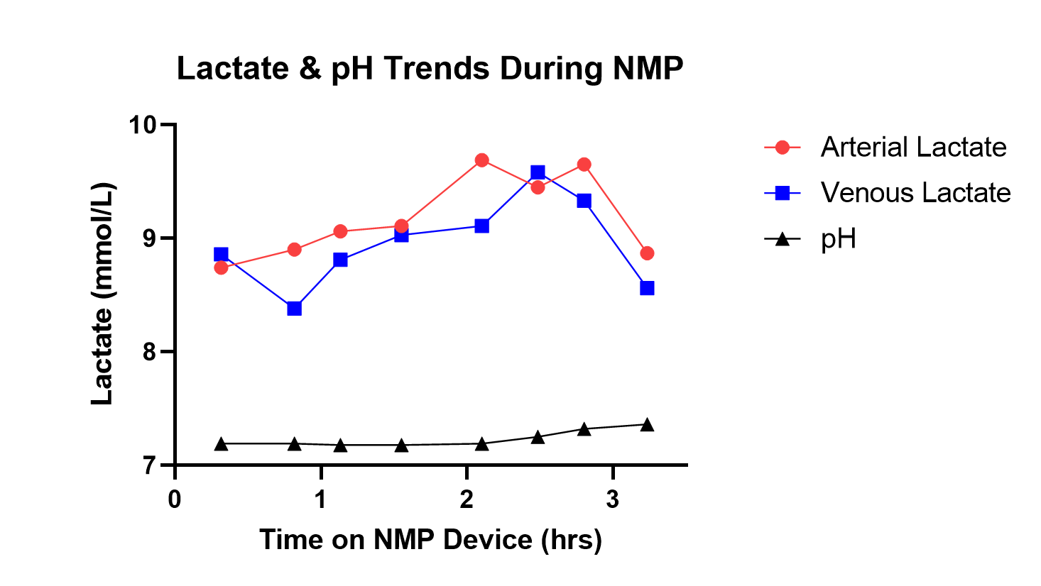 Results: NMP perfusion following MAD was notable for point of care sampling demonstrating an upward lactate trend and associated metabolic acidosis up to 146mins. Given the presence of arterio-venous lactate extraction for the majority of NMP, satisfactory visual RV contractility, and haemodynamic performance, the decision was made to continue with the transplant. The heart was successfully transplanted into a 52-year-old male recipient following a re-do sternotomy and explant of a HeartMate3 LVAD. The recipient was weaned off bypass easily with no signs of acute primary graft dysfunction. ICU length of stay was 2 days. The patient did not require any form of dialysis and remained alive after >60days.