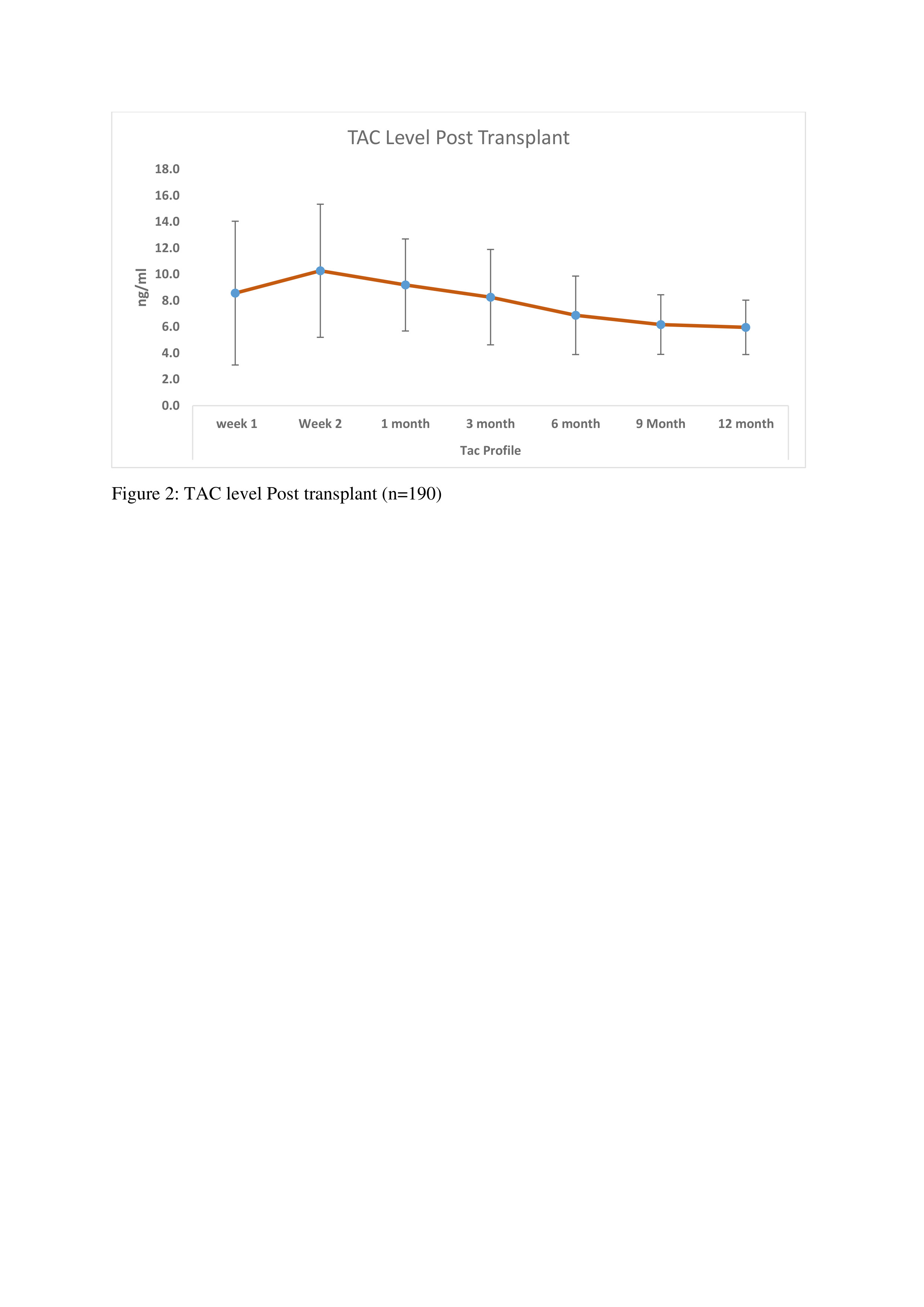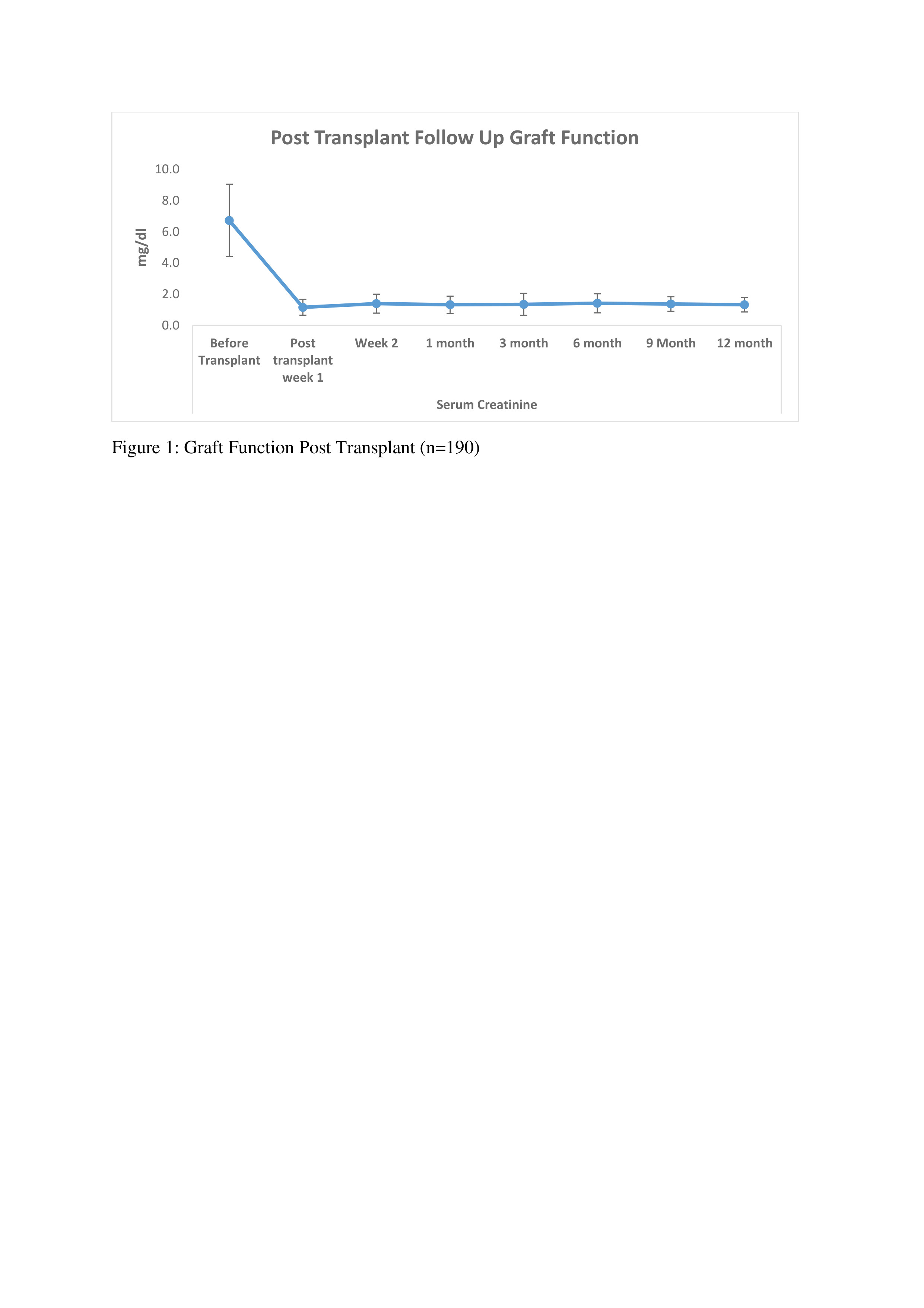 Results: In our retrospective analysis, 190 patients received ATLG as an induction agent on day of Transplant. The mean age of the patients was 40.23 ± 12.9 years. Out of 190, 149 (78.42%) were Male and 41 (21.57%) were Female. mean weight was 64.7 ± 12.6 kg. Regarding underlying kidney diseases, diabetic nephropathy (20%) and chronic glomerulonephritis (23.15%) were predominant. The mean cumulative dose of ATLG was 268.3 ± 89 mg, with a mean dose of 4.14 ± 1.4 mg/kg. Tacrolimus, mycophenolate sodium, and prednisolone were used as maintenance immunosuppressants. Patient survival rates were high at 186 (97.89%), with 4 (2.1%) patients dying due to septic shock and multiorgan dysfunction syndrome (MODS). Post-transplant graft function and tacrolimus levels were also evaluated at 3, 6, 9, &12 months, as shown in Figures 1 and 2. Rejection episodes included acute cellular rejection (12, 6.31%) and antibody-mediated rejection (4, 2.1%). Other complications observed in our study were acute tubular necrosis (11, 5.78%), acute tubular injury (4, 2.1%), pyelonephritis (2, 1.05%), and patchy necrosis of renal parenchyma (2, 1.05%). Disease recurrence occurred in 2, (1.05%) of cases, primarily IgA nephropathy. Additionally, re-admission post-transplantation was observed in 23, (12.1%) of cases.
