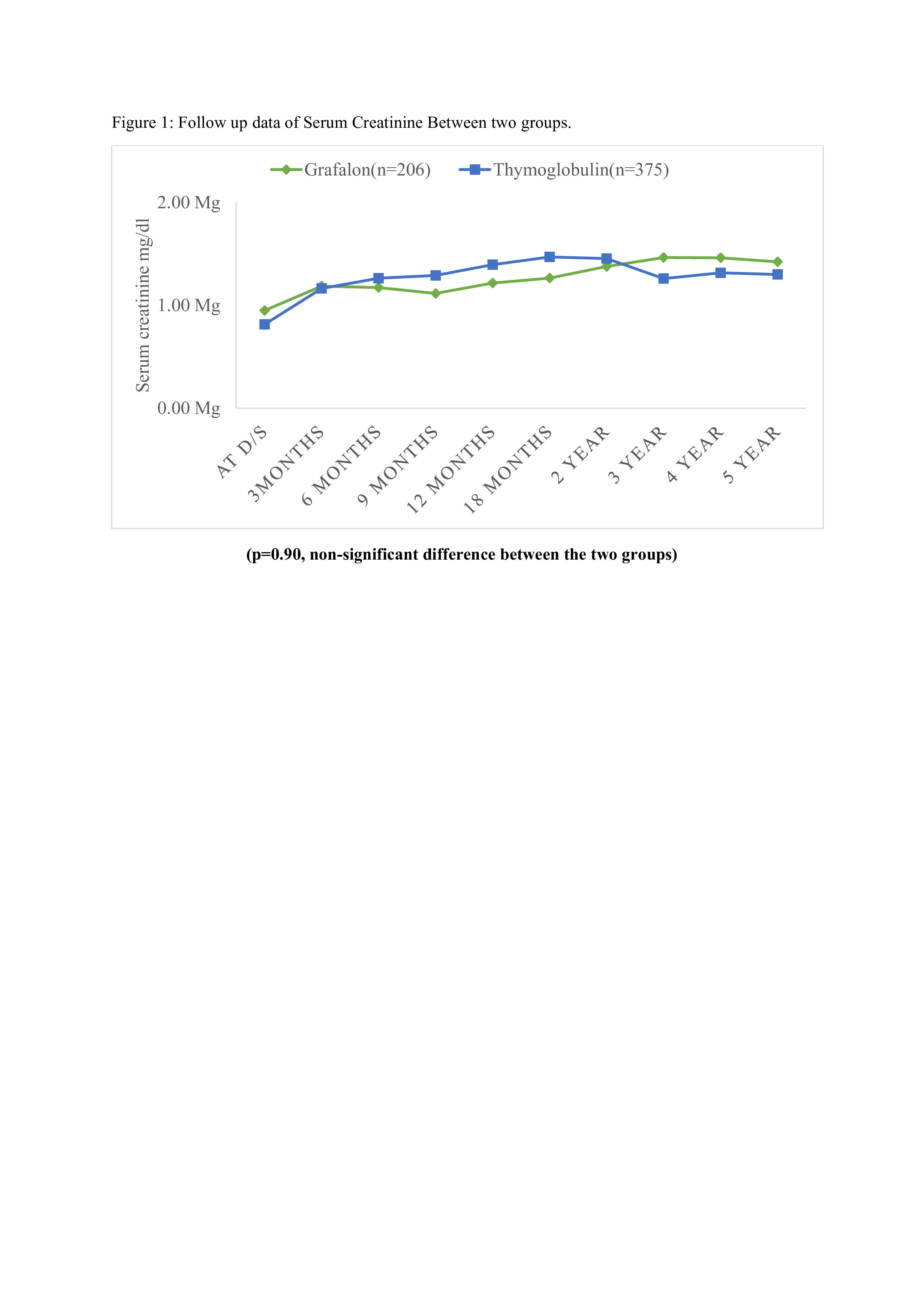 Results: The average duration of follow-up spanned 60 months. The mean doses of Grafalon and Thymoglobulin were 5.4±1.4 mg/kg and 2.37±1.2 mg/kg, respectively. Baseline characteristics were consistent across both groups. Figure 1 depicts the serum creatinine levels at discharge and during subsequent follow-up intervals. Table 1 provides a comprehensive overview of rejection outcomes over a 5-year follow-up period, distinguishing between the Thymoglobulin and Grafalon cohorts. Notably, there was a higher incidence of de novo diseases observed within the Thymoglobulin cohort (12 cases, 3.2%) compared to the Grafalon cohort (3 cases, 1.4%). However, the incidence of infections exhibited comparability between the two groups.
