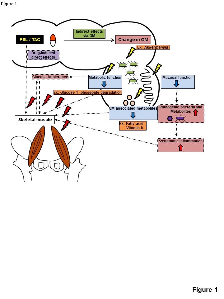 Method: C57BL/6J male mice were randomly divided into the 7 groups (N=3 mice per group): control (PBS), tacrolimus (TAC) high dose, TAC low dose, cyclosporine (CyA), everolimus (EVR), mycophenolate mofetil (MMF) and prednisolone (PSL). These mice were administered each solution by gastric gavage once a day for 28 consecutive days. As an evaluation of muscle mass, the cross‑sectional areas of psoas muscle on computed tomography (CT) imaging and myocyte cross-sectional length on pathological specimen were assessed. Crypt depth and Muc-2 expression were evaluated to evaluate colonic mucosal function. In clinical study, we compared the change rate in psoas major muscle volume before surgery and 1 year after surgery in 18 living donor KT recipients and 16 donor patients who underwent surgery at our hospital from December 2020 to August 2023. The diversity and composition of GM were analyzed using 16SrRNA sequencing. To predict the functional potential of a bacterial community based on marker gene sequencing profiles, PICRUSt2 analysis was performed.